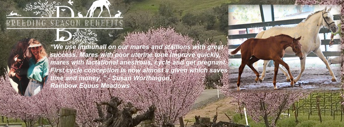 “We use Immunall on our mares and stallions with great success. Mares with poor uterine tone improve quickly, mares with lactational anestrous, cycle and get pregnant. First cycle conception is now almost a given which saves time and money. Stallion’s libido is up and semen longevity greatly improved as is their post thaw motility on frozen semen.”