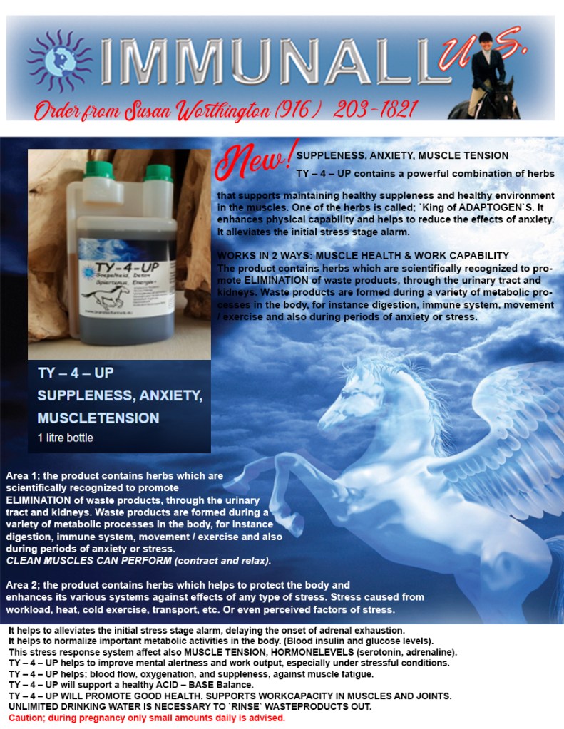 Our products are completely different to anything else currently offered on the market. One of the many reasons why our products are used and trusted by professionals around the world is their 100% natural, synergetic effect on the body, which produces fast results. Therefore, we believe Immunall and After Ace offer a multitude of cost-effective opportunities for you and your horse. However, we’ll leave that matter of judgment up to you…Call successful sport breeder and competitor Susan Worthington for advice at (916) 203-1821.